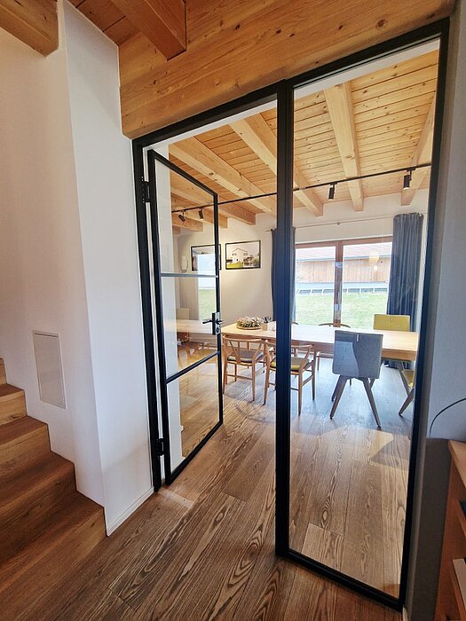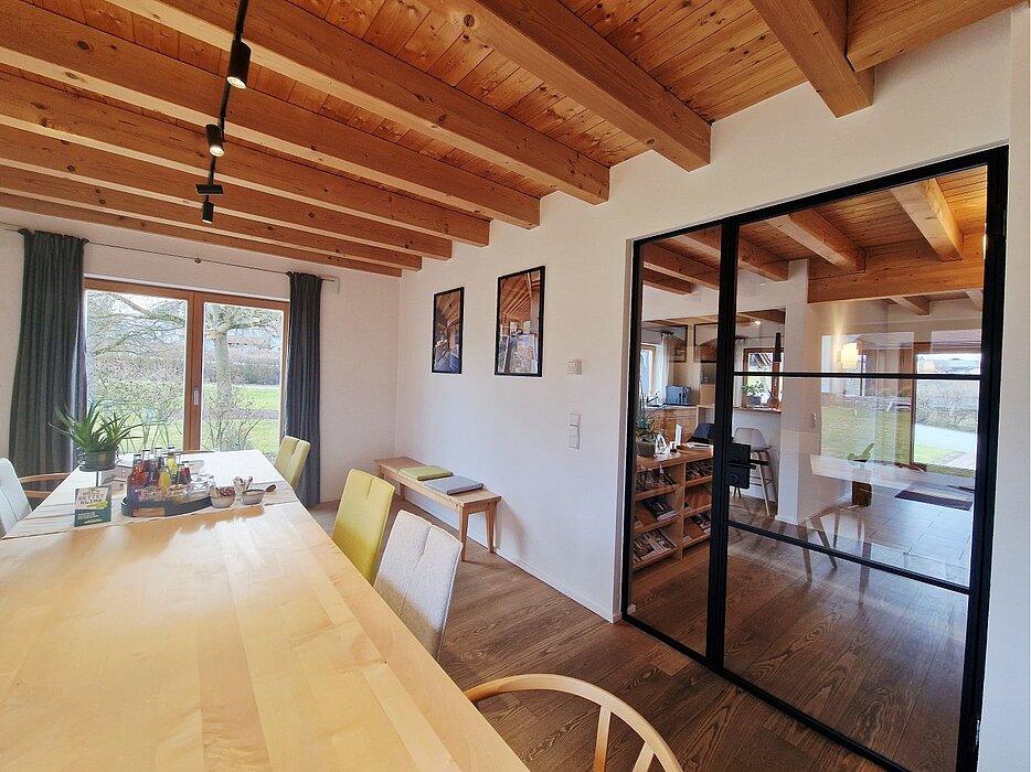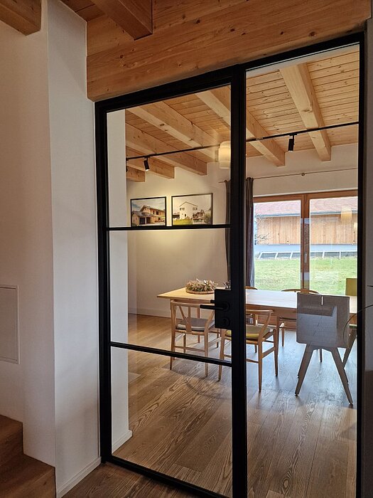 Ein gläsernes Türelement führt in den separaten Wohnbereich, den wir im Musterhaus als Besprechungsraum nutzen. Große Terrassentüren lassen viel Tageslicht herein und verbinden Innen und Außen. Der traditionelle, verputzte Kaminofen sorgt dabei für die Extraportion Behaglichkeit – eine perfekte Mischung aus Transparenz und Wohngefühl.