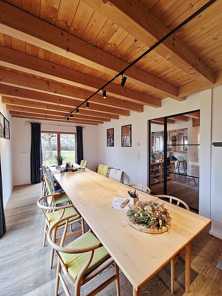 Drinnen werden Sie von einer großzügigen, offenen Diele empfangen. Von hier aus geht es direkt in die modern gestaltete Wohnküche – gemütlich, hell und ein echter Treffpunkt. Holzdecken, zarte Pastelltöne und weiße Wände schaffen eine warme, freundliche Atmosphäre. Über dem Essplatz öffnet sich eine Galerie mit großen Glasflächen, die dem Raum noch mehr Licht und Weite schenkt.