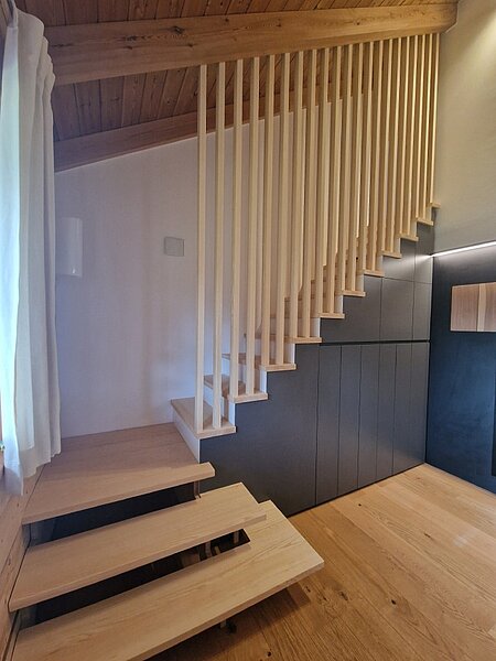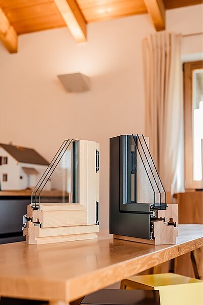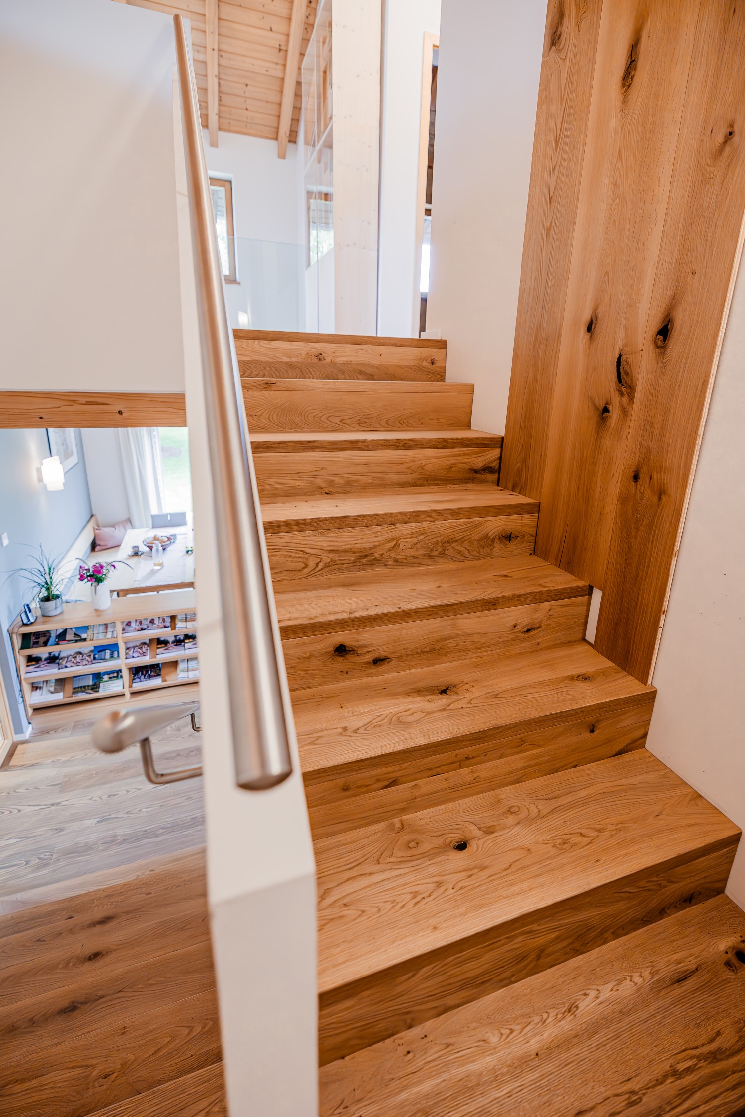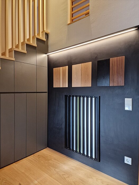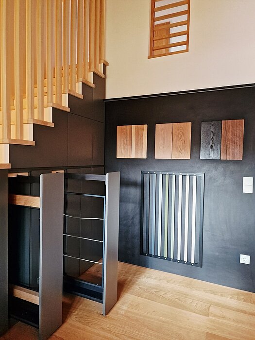 Über eine moderne, schlicht gestaltete Podesttreppe gelangen Sie ins Obergeschoss. Dort zeigen wir Ihnen, wie vielseitig Ihr zukünftiges Zuhause gestaltet werden kann: Bodenbeläge, Türen, Fliesen, Treppen oder Geländer – hier können Sie Materialien anfassen, vergleichen und auf sich wirken lassen. Auch technische Details wie der Wandaufbau werden anhand anschaulicher Modelle verständlich erklärt.