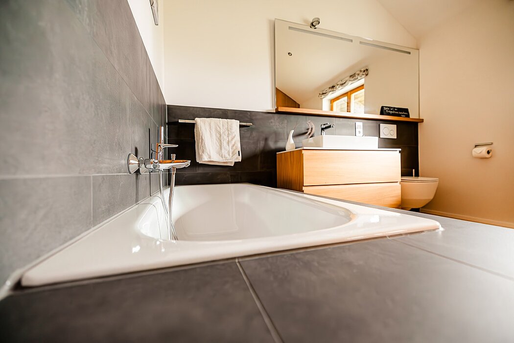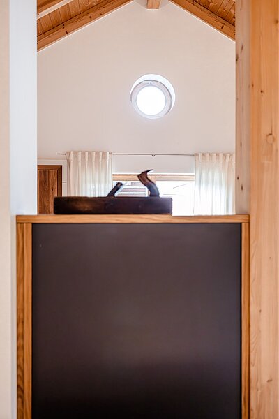 Schon von außen zeigt sich das Haus als klassisches Langhaus mit vergrauender Boden-Deckel-Schalung. Also eher traditionell? Auf den ersten Blick vielleicht. Doch moderne Details wie Holz-Schiebeläden und das runde Bullauge im Giebel setzen spannende Akzente und schlagen die Brücke zur Gegenwart. Der hohe Kniestock sorgt für viel Platz im Obergeschoss, und Fenster auf drei Seiten eröffnen wunderbare Ausblicke in die Landschaft.